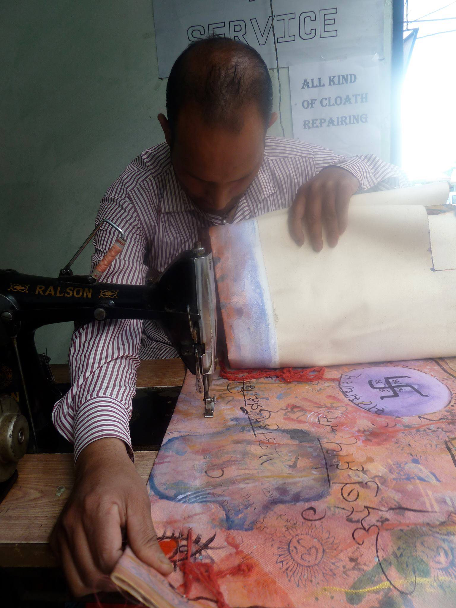 I went back to the tailor to have a casing sewn into the top edge of the canvas. so a rod could easily be slid through and used for suspending the piece. I made slits in the casing area every few feet so additional support could be used for such a long span.